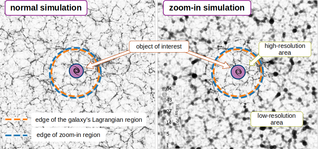 The predictions derived from these virtual experiments however are limited by the size of our computers. Even the largest supercomputers in the world can not follow in all details the interconnected physical processes at play in the Universe, forcing a choice between simulating large volumes at low resolution or only few objects with high accuracy. THESAN-ZOOM does the latter using a technique called zoom-in. Like a camera, the simulation will focus most of its attention on a single galaxy or small group of galaxies.